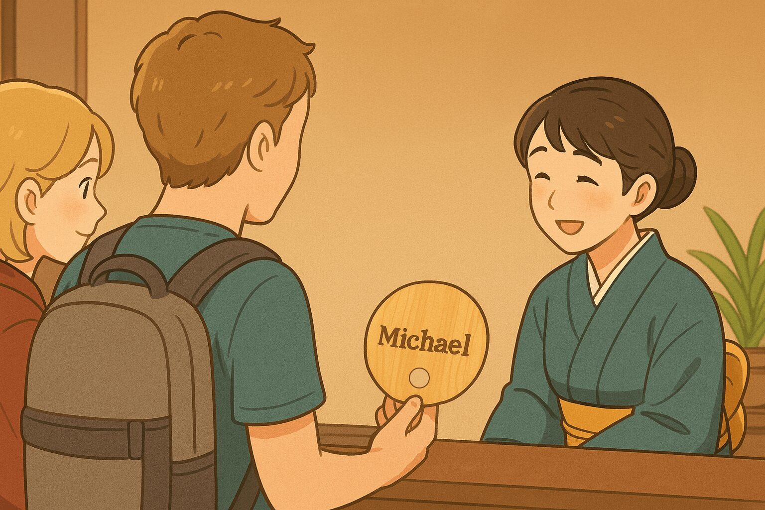 チェックイン時に渡された木製アイテムに、自分の名前が刻まれている。