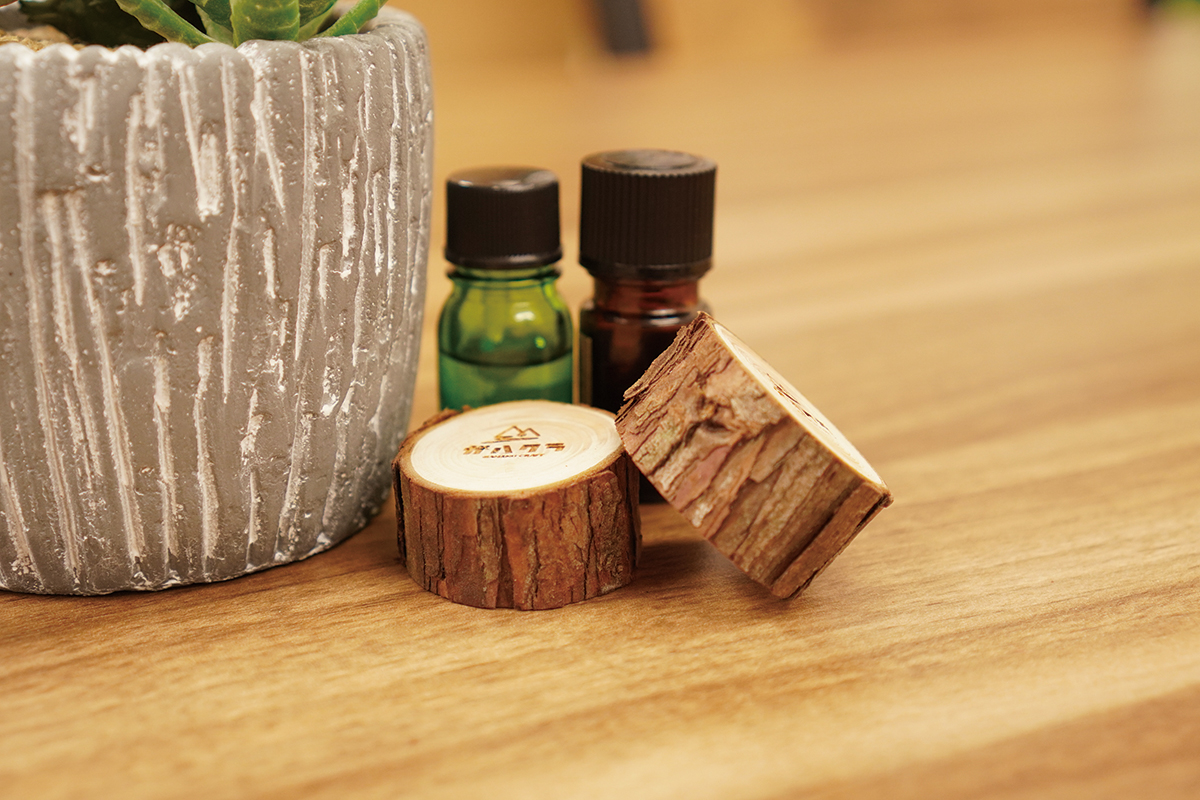 表面にアロマオイルを数滴垂らすことで、ヒノキのやさしい香りが広がり、空間にほのかなリラックス感をもたらします。電源や火を使わないため、デスクまわりや玄関、寝室など、場所を選ばず安心してお使いいただけます。